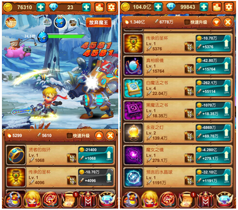 游戏中宝物是英雄战力的保障,宝物专属被动技能为整个战斗提供多种永久攻击Buff。前期在金币容许的情况下尽量购买新的宝物,如征战之路变颇为艰难,便尝试开启已有宝物的专属被动技能,惊人的属性加成助你轻松闯关。