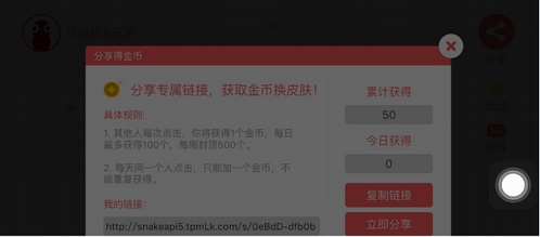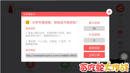 2.在分享界面有具体的分享和金币的获取规则:其他人每次点击,你将获得1个金币,每日最多获得100个,每周封顶500个;另外每天同一个人点击只能增加1个金币,不能重复获得。按照提示,点击“复制链接”或“立即分享”按钮。