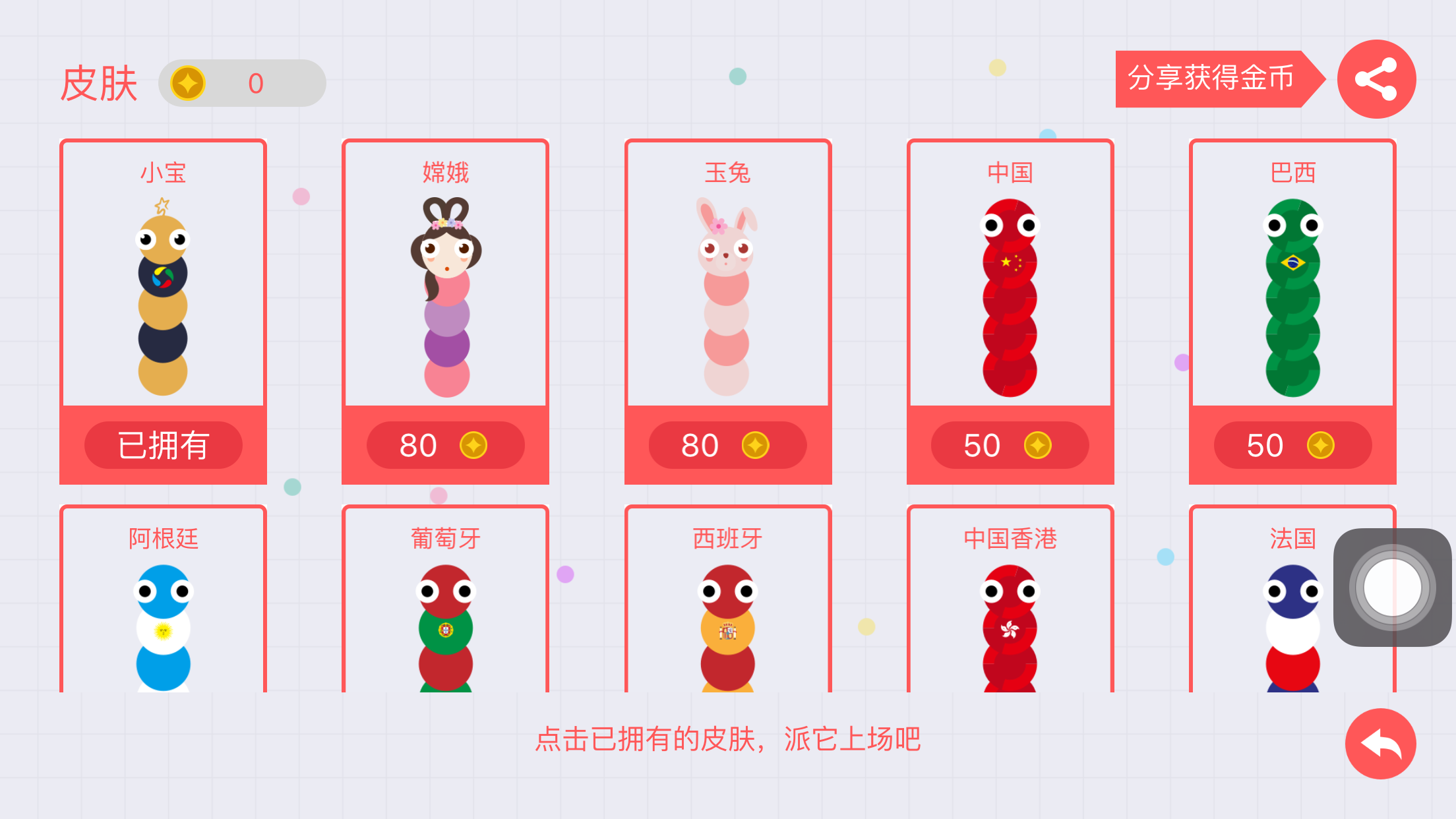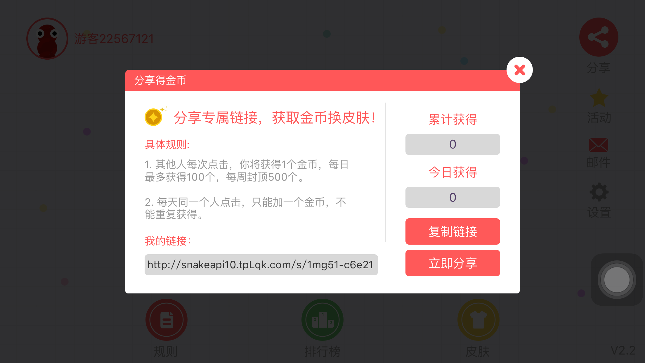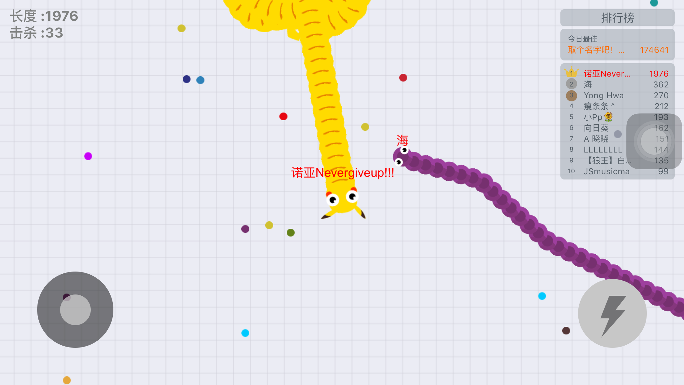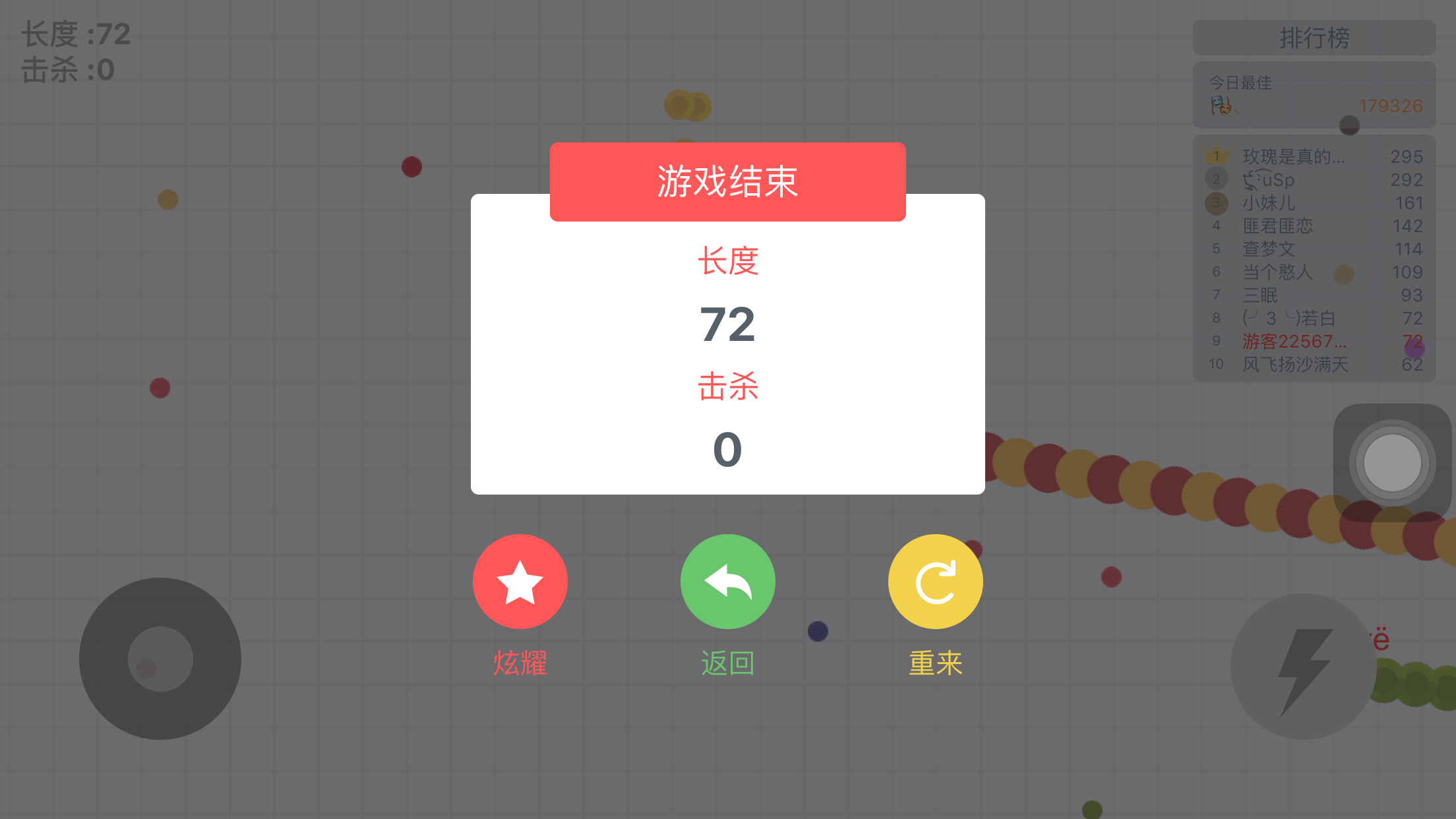 熟悉游戏的规则: 游戏进去之后,左下角有规则,其实我和大家说一说也可以,很简单的。要吃掉小豆豆,之后我们要利用贪吃蛇的移动,围住别人的贪吃蛇,他们的“尸体”的豆豆可以更快提高我们的生命值。 ![]() 吃到更多的豆豆: 游戏当中进去和球球大作战一样,有免费的豆豆可以吃,不过一般比较小,当然数量可观的话身材也会增长的很快,特别是限时模式一开始,大家都是一样的。 ![]() 想办法围住别人的贪吃蛇: 等到你的贪吃蛇的尾巴比较长之后,就要想办法多移动,绕圈子,特别是有别人的贪吃蛇的时候,把他们围住出不去了就会碰到你的贪吃蛇,他们被你杀掉之后,你就可以吃他们的豆豆了。 ![]() 不要碰到墙壁: 在移动的时候,不要太靠墙壁,如果碰到墙壁我们的贪吃蛇会自动被消灭,我们的豆豆就只能被别人吃到了,所以看到墙壁的时候,尽可能的转弯,去避开。 分享游戏获得金币: 结束游戏之后,如果我们的贪吃蛇拿到了很高的分数,可以通过几种方式去分享,游戏主界面也可以分享这个游戏,可以拿到游戏当中的金币。 ![]() ![]() 金币可以购买贪吃蛇的皮肤: 贪吃蛇大作战里的金币对游戏没有帮助,和球球大作战一样,可以解锁皮肤,因为贪吃蛇大作战刚刚上线,所以皮肤还不多,价格也比较便宜,大家赶紧入手。 ![]() |
