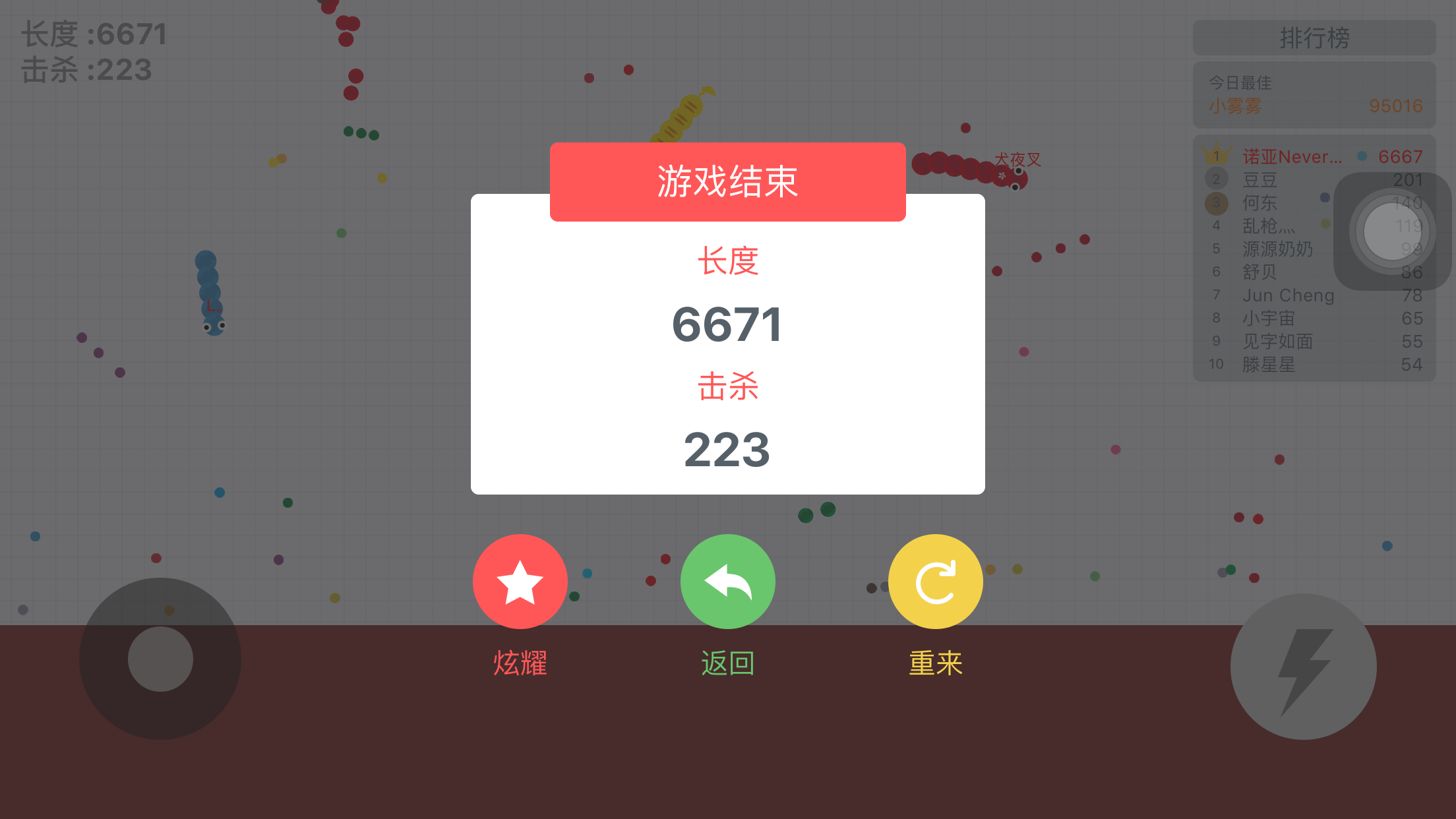 小时候玩的经典游戏《贪吃蛇》,现在华丽升级为《贪吃蛇大作战》,全新玩法等你来挑战!这是一款超好玩的休闲竞技游戏,不仅比拼手速,更考验你的策略!在贪吃蛇大作战的世界中,每个人在初始都化身为一条小蛇,通过不断努力变得越来越长,终于成长为贪吃榜排名榜首的贪吃蛇哟。一个简单的游戏,2个操作建。一旦上手根本停不下来。我们就来讲讲如何在众多蛇类中脱颖而出,争夺冠军。 ![]() 其实无尽模式跟上述基本差不多,只不过在无尽模式中我们更注重保命,宁可漏杀也绝对不能死,打发就相对比较保守。可以慢慢的吃光点长大,躲避大蛇的围剿。 当你大于1000以上时就可以围着自身转圈,把蛇头藏于身体之中,守株待兔。自然会有很多小蛇操作失误而撞上你,一边吃光点一边捡掉能量光圈就好了。无尽模式更需要耐心和沉稳,保守的操作你会变得越来越大地图变得越来越小,周边的蛇会变得比你小好几倍,你的视线比他们更广阔,更不容易死。只要不失误基本上死不掉的。除非运气差刚好有一个刷新的小蛇在你蛇头前面被你撞上。 ![]() |