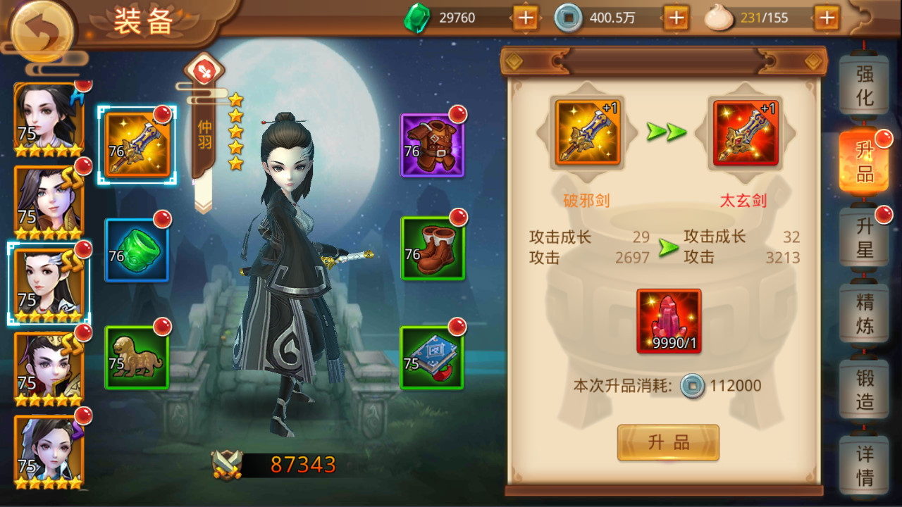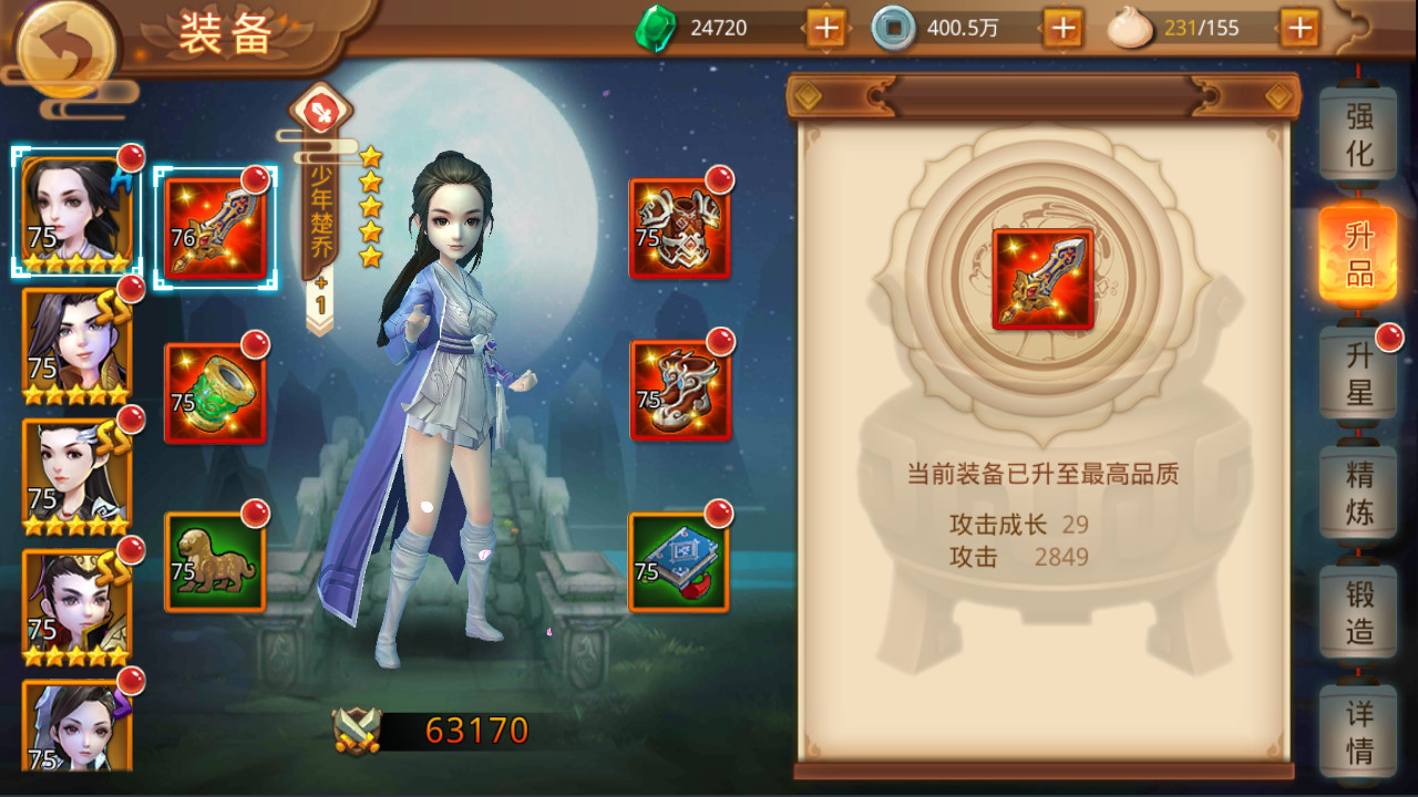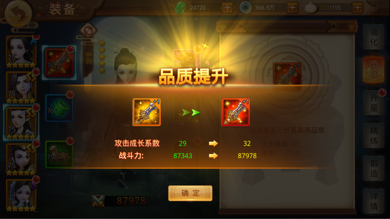 武将的装备可以在“武将—装备”界面进行升品,升品可以提升装备的品质,同时提高装备的各项属性,从而提升武将的战力。