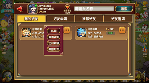我的好友:在我的好友界面中,您所拥有的全部好友都能一目了然。同时,您可以对自己的好友进行私聊、查看详细、访问城镇和删除好友等操作。瞧瞧人家的佣兵,再和自己的对比一下,是不是在同一水平线上?再瞧瞧人家的城镇和布置的格局是不是和您的不相上下呀?