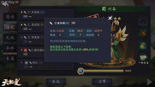 【蜀.刘备】 刘备在《天机变》中作为蜀国领袖,他对蜀国武将拥有神一般的存在,为何?且看他各种技能就知晓。 品质:橙将;武器:雌雄双股剑;武将特点:攻血突出。 招式:刘备绝技仁者无敌,不仅对敌方武将造成不可挽回的伤害值,更对我放武将当前最大生命+20%,持续1秒。可谓主公在手,瞬间满血复活。 推荐理由:刘备作为《天机变》主流战将,多数人都喜欢选择,优点是他能攻能守,用的顺手。缺点是作为仁者无敌作为刘备绝技,激活具有条件,对武将星级有要求。