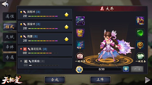 【吴.大乔】 大乔,著名三国闺秀。她火的过范冰冰,人气高出AngelaBaby,孙策配偶、孙权之嫂,据传为全民女神。 品质:橙将;武器:冰晶神扇;武将特点:攻血突出。 招式:大乔招式抚慰术、振奋术都能对我方血量最少的武将起到回复血量的技能效果。 推荐理由:大乔作为一名橙卡,其战力自然毋庸置疑,且最为难得的是她的回血技能不需要额外的条件,作为普通招式,在战斗中可随意触发,对我方血少的武将可以起到很好的援护作用。
