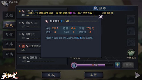 【魏.静姝】 在《天机变》上百位战神武将中,静姝作为一名传奇女子,总是默默无闻,不为人所注意。今天小编就要告诉各位:莫欺少年穷。莫看她无名,毕竟AB当初也是一名小小的嫩模而已。 品质:紫将;武器:香凌扇;武将特点:攻血突出。 招式:静姝绝技回天秘术,可以对我方血量最少的武将加血,当绝技达到5阶的时候,可以让一位濒死武将瞬间复活,这奶也是蛮惊人的。 推荐理由:静姝作为《天机变》魏国早期的武将,容易获取,且元魂也有多种途径可以轻松得到,升星快,好培养。