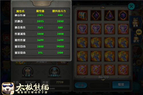 《太极熊猫》最新版本吸血抗暴套搭配介绍。《太极熊猫》中,每个套装都极富特色,玩家可以随心所欲的选择自己喜好的套装,今日小编为大家带来的便是其中比较有特色的吸血抗暴套,一起来看看吧! 最新版本的《太极熊猫》极大强化了抗爆套装,重点是抗爆可以堆很高,甚至200%以上,这也是很多双暴套装难以达到的暴击率,因此双暴套装在和抗爆套装pk时很难发挥出优势。并且抗爆套装也能把自己的暴击率和暴击伤害堆到100%和180%以上。然而6月1日新出的儿童节专属称号更是有10%吸血,更加强化了抗爆套装。那么问题来了,双暴套装为什么不能用10%吸血呢?双暴套装如果用这个称号,如果不换其他装备,吸血很难堆高,吸血不够高也就没什么用了! 【装备搭配】 头:死神头。衣服:昊天钢铁之心。武器:死神武器。鞋子:海洋鞋子。项链:天命项链。手臂:死神手臂。戒指:死神戒指。