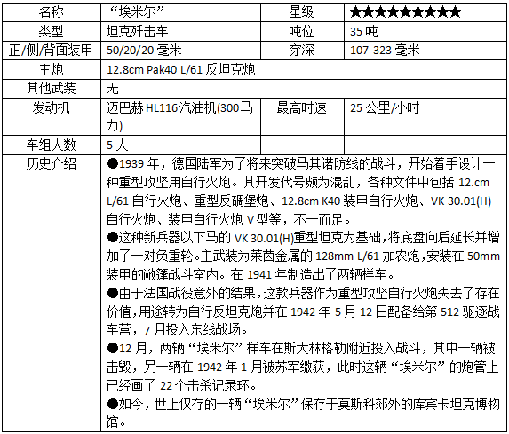 关于“埃米尔”的故事就由小编简单的来介绍下吧~ “埃米尔” 是由亨舍尔公司负责两个地盘,莱茵金属负责两门主炮。亨舍尔决定采用以前制造的两辆VK 30.01(H)战车,后来成为虎式战车前身,车身拉长大约两公尺,因为得容下莱茵金属的12.8公分巨炮。“埃米尔”就这样联合诞生啦~威力超群的主炮威力和射程,也最终造就了这个在战场上不断一击必杀的大杀器!