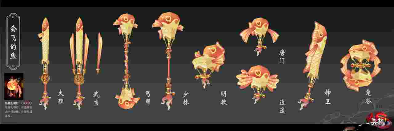 节日庆礼武器——碧海莹灯。想要一帆风顺万事顺心,那么这款新武器“碧海莹灯”一定是侠士们的不二之选。以锦鲤为原型,并加入孔明灯元素,让整个武器充满童趣又不失国风韵味,红金配色更显富贵之意,想必未来侠士也定是如这红金色碧海莹灯一般,红红火火、金钱不断。
