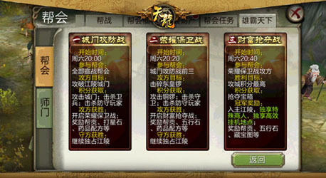 【城战】雄霸天下 是否总在抱怨英雄无用武之地?参与城战为帮会攻城略池,尽显英雄本色。财富抢夺,体验一把当地方霸主的快感。若你是城池防守方,想向帮主展示你的机智英勇?此刻就是机会!最终胜利的帮会,将会获得下面的丰厚奖励: 1.获胜帮会将入主江陵城 2.独立练级场景和专属城市商店