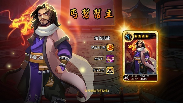 【主人公二】 洪七公为第十八代丐帮帮主,为人正义且机智,生性贪吃,曾经因贪吃误事,自断其右手食指,故也称“九指神丐”,无论黑白两道都十分敬重他。洪七公和蔼正义,具有一切正派人物所应具有的优点,其独门武学为“打狗棒法”及“降龙十八掌”。