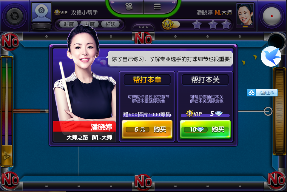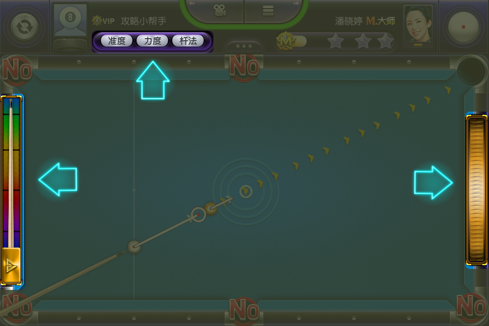 击球后,球桌上方的准度、力度和杆法状态灯会给出反馈。 准度灯亮红灯的时候,说明瞄准的角度偏差很大,需要瞄准点。界面右侧是角度调整滑轮,手指比较粗没法看到挡住的部分时,可以利用这个滑轮进行特别小的调整。 力度灯亮红灯时候,说明你的击球力度过大或过小了。这时候你可以观察力度条顶端出现的数字来进行微调。 杆法灯亮红灯的时候,说明在母球上加的杆法位置不对,要多加尝试。 如果三盏灯都亮绿灯,你还没打进的话,那就是运气太差啦,洗把脸再打一杆试试吧!