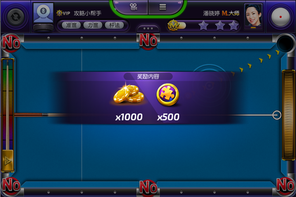 如果玩家能将所有目标球击入袋口,至少能获得一颗星,同时让母球走位到光圈,基本上就可以拿下两颗星了,母球进入内圈,玩家就可以三星通关可获得本关大师徽章一枚。