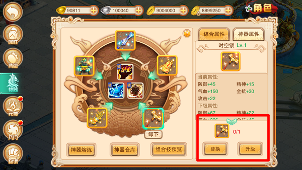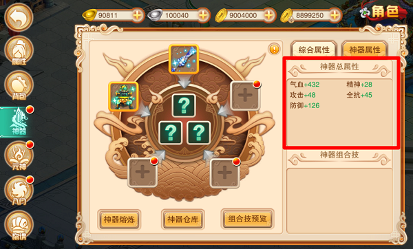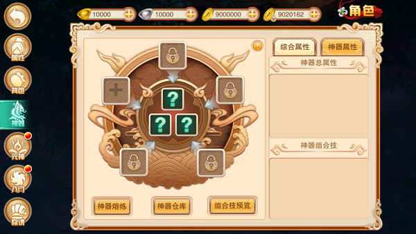 《剑侠风云》中我们化身的小侠客在修仙途中唤醒了沉睡千年的神器,人们一直苦苦追寻的神器之力到底是什么呢?下面我们就来看看《剑侠风云》中的神器到底有什么样的神力。 一、 神器玩法开启 玩家到达40级以后就能开启神器玩法,打开角色界面就能看到神器按钮,点击即能切换到神器界面。 ![]() 二、 玩法介绍 【获得神器】 挑战世界BOSS和万千化身都有几率获得神器。 ![]() ![]() ![]() 游戏中拥有非常多的神器,每件神器都能给玩家提供强大的属性支持,玩家所获得的属性是所有已装备神器属性的总和。 ![]() 每件神器都能够进行升级,神级神器需要消耗一个相同的1级神器。 ![]() 神器的强大之处不仅能提供强大的属性,而且根据不同的神器组合能够触发不同的神器组合技能,最多能触发3个神器组合技能。 ![]() ![]() 任意3个一级神器都可以随机熔炼成一个一级神器,如果玩家有多余的神器而且缺少某个特定的神器,那么可以使用神器熔炼来获得新的神器。= ![]() |