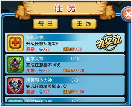 任务引导着我们的英雄,从无名小卒一步步走向强大的道路。完成任务的奖励更为丰厚,可以得到不同数量的钻石哦!
