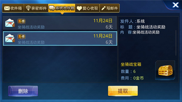 坐骑战的奖励都是通过邮件发放,每次对战可以获得两封物品邮件,一个是竞技石,另一个就是坐骑战宝箱。宝箱里能开出坐骑经验丹或者坐骑技能书。无论输赢,给的宝箱是没有区别的,唯一的区别就是赢家给的宝箱数量比较多。