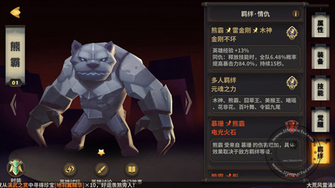 熊霸能够和雷金刚、木神形成三人英雄羁绊同仇,概率提升全队的暴击力一定时间;由于这三个英雄都是偏防御的英雄,组成的三人队实战效果很一般,所以这个羁绊也没有多大的意义! 能够形成多人羁绊提升一定的属性以及经验获取! 那么以上就是这次给大家带来的天下X天下熊霸属性及技能使用分析,希望对大家有所帮助,更多攻略请查看360游戏大厅天下X天下专区! |