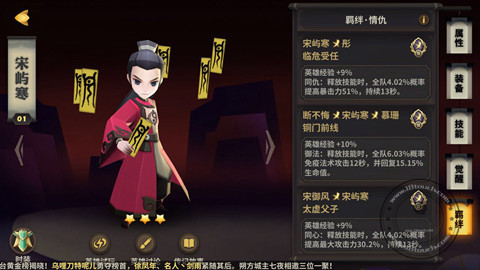 英雄羁绊方面,能够和彤形成同仇效果,有一定的几率增加全队的暴击力; 能够和断不悔、幕珊形成三人羁绊,御法,是全队有概率免疫法术攻击并且回复少量的生命; 和宋御风形成双人羁绊通信,有一定概率增加全队的最大攻击力,提升队伍的输出! 总体而言,如果使用宋屿寒推图完成日常任务的话,选择和彤或者宋御风的组合效果比较不错! 那么以上就是这次给大家带来的天下X天下宋屿寒英雄技能使用分析,希望对大家有所帮助,更多攻略请查看360游戏大厅天下X天下专区! |