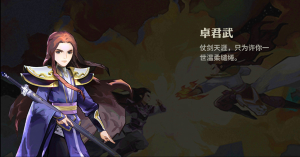 卓君武 卓君武是弈剑听雨阁第十五代掌门阁主,自幼与冰心堂的紫荆青梅竹马,感情甚笃,执掌门派后即成婚。当太古铜门打开,无数妖魔侵占大荒之时,紫荆为了医治在战斗中身染浊气中毒的卓君武而付出巨大代价,长久陷入沉睡之中。卓君武毅然辞去掌门之位,前往太古铜门内寻找解救紫荆之药。可他不幸遭幽都王控制,成为灯灵夜歌的饲食。在遭受幻境、噩梦的痛苦折磨之后,矢志不渝的初心和信念支撑着他最终打败夜歌,继续踏上寻找解药之路。