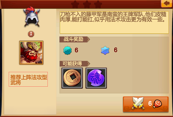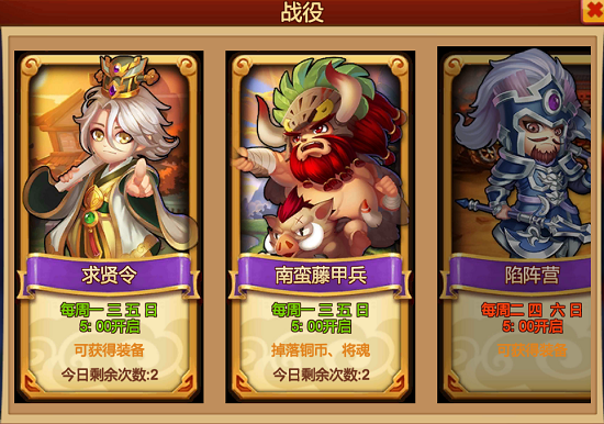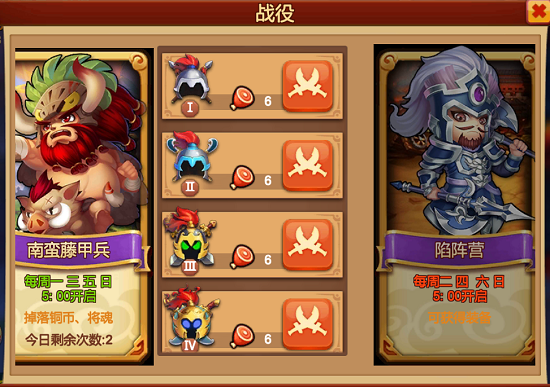 战役共分为陷阵营、南蛮藤甲兵、七星台、求贤令四个副本,每个副本开启时间不同,每日可挑战