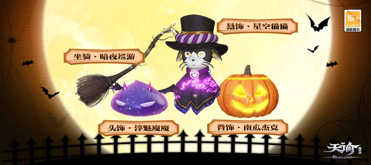 万圣节又怎么少得了捣鬼的南瓜和飞天的扫帚!背上闪闪发光的南瓜杰克,骑着暗夜巡游的扫帚,绮丽世界任你畅行!更有神奇的魔术猫猫悬饰和小恶魔头饰助你成为百变的黑夜精灵~午夜钟声敲响,奇幻之旅就要开启!