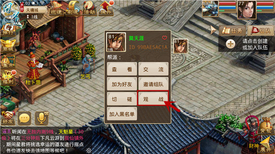《问道》手游观战系统,顾名思义,就是让道友们充当观众,观看其他人之间的战斗信息。 【开启观战】 在《问道》手游中,道友只要点击战斗中的玩家,就会跳出交互菜单,此时点击交互菜单的观战按钮,便可尝试进入观战状态啦。