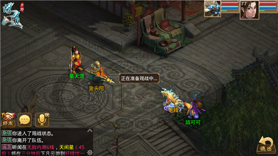 【观战流程】 在观战状态下,道友们的游戏画面将会切换为战斗界面,看到的战斗信息也与战斗玩家所接收的信息保持一致。同时观战的角色头部上方将会增加一个观战标志,为银白色的两把剑打斗动画。观战界面的右下角,会有一个“退出”的按钮,道友若是无心观战了,点击即可退出观战。