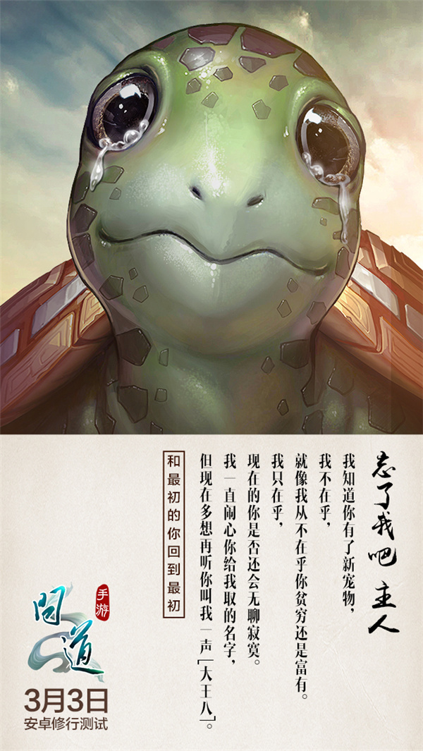 【忘了我吧主人】一直闹心你给我取的名字,但还是想听你再叫我一声“大王八”。也许你的身边早已跟随了更强力的伙伴,也许我早已被你遗忘在时光的河流中,但我依旧记得那个曾经跟我亲密无间的你。忘了我吧主人,但你不能忘了3月3,我在《问道》手游等你归来。