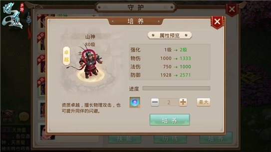图4 《问道》手游山神培养游戏界面 完成历练和培养之后,守护便会得到极大的增强,很多时候都可以代替其他角色与道友们组队,一个人也可以玩的很嗨!
