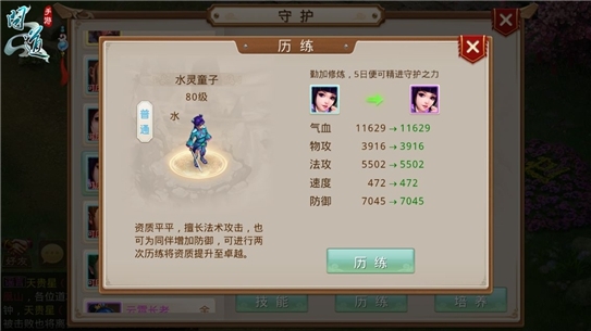 图3 水灵童子历练游戏界面 其次是培养,道友们用元气丹来培养守护,守护培养可以激发潜能,使守护得到强化,大大增加了守护的物伤、法伤和防御。每一次培养需要投入2-6个元气丹,元气丹可在帮派商店和竞技场商店进行购买。元气丹投入数量越多培养成功率越高,若培养失败也会累加培养完成度。