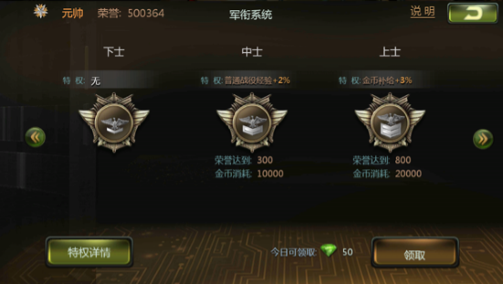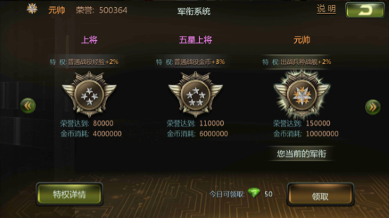 顺带一提,在军衔系统中可以领取钻石,军衔等级越高可领取钻石越多,每日只能领取一次,军衔特权可累加获得,也就是说当你晋升新等级后,原先的特权还会保留,想想当上元帅那一瞬间,什么金币补给经验增加爽到爆!至于荣誉值怎么刷嘛,玩家可以在【军事演习】和【阵营战】中主动战斗获得,也可以在【群雄逐鹿】中翻牌获得,各位玩家请努力向元帅一职努力吧! |