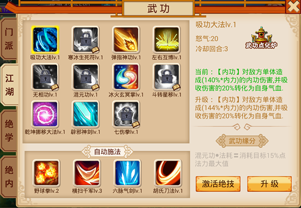 每一个武功都是其相应的搭配武功,好的武功搭配大大提高你的屠杀能力!!!现在想想最好的武功搭配就是可控,可攻,可防,可回复了!究竟如何才能搭配这样的武功呢?这个还需要各位去慢慢研究了……目前小编还没有研究出来~~~~ 这四类武功都是可以升级的,只要学习了武功并且达到升级条件(资质足够,武功经验足够)就可升级了!值得一说的是对于我们屌丝来说每天一次的快速挂机不只是能快速获得经验,快速获得武功经验也是一个非常不错的办法哦! 最后要告诉大家的就是《武林浩荡》的每个武功都会有相应的缘加成的,不同的缘效果也是完全不同的~~要根据自己的喜好去学习相应的武功哦!