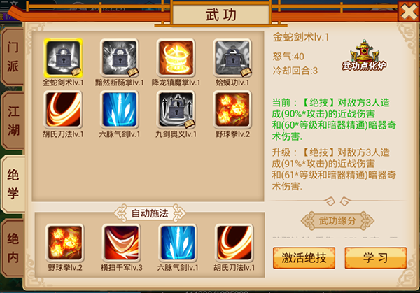 绝学,绝内就是最上层的武功了!同样的也是需要秘籍的,不过这个秘籍可是可遇而不可求哦!!除非你掉进某个山洞,再不就是遇到哪个旷世高人!吼吼……