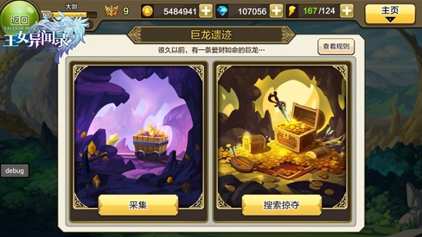 进入充满魔法的世界,选择探索巨龙遗迹,你将面对两个选择。一是自行采集各种财宝,二是掠夺别人的战利品。 如果你选择了自行采集,你可以进入充满沙漠一片荒芜的龙脊荒丘,或者生存着各种飞鸟异兽的龙湖雨林,再或者就是传说中龙的栖息地——水晶龙城。