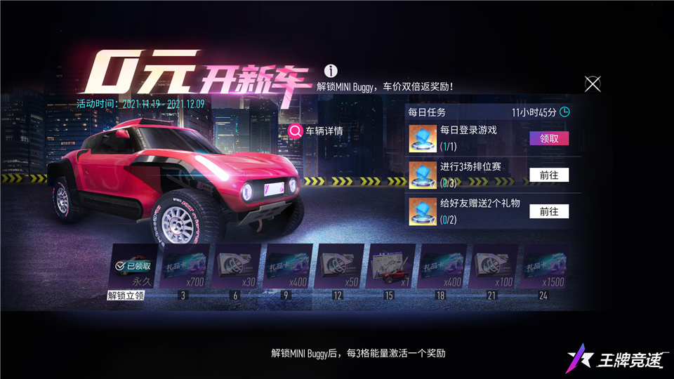 免费领取,畅享越野乐趣 为了让更多车手能够体验到MINI Buggy的独特魅力,《王牌竞速》将于本周开启0元购新车活动。车手们支付一定礼品点后,即可永久解锁MINI Buggy,在12月9日前可通过完成每日任务获取能量,激活奖励,轻松赢回购车款,享受“0元购新车”! 本轮0元购新车活动共设有8档奖励,每档奖励需消耗3格能量解锁,奖励内容包括礼品点、巨化光束零件、MINI Buggy蓝图,解锁全部8档奖励后,车手们不仅可以获得双倍礼品点返还,还可以使用零件和蓝图提升车辆等级,获取更强劲的竞速性能!