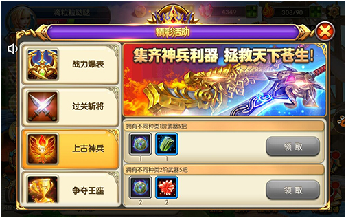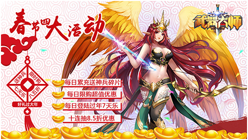【春节四大活动:送新年第一份大礼】 活动范围:全服 活动时间:2月5日-2月14日 活动内容: 1、每日累充送神兵碎片:活动期间,每日累计充值30元、98元、198元,即可领取对应条件赠送的湛卢剑、霸王弓、盘古开天斧的碎片! 2、每日限购超值优惠:活动期间,购买限购大礼包,即享超乎你想象的超值优惠! 3、过年七天乐:活动期间,每日登陆游戏,都可领取到一份精美的春节礼物,连续登陆更有七重好礼! 4、十连抽折扣:活动期间,钻石十连抽可享8.5折优惠!
