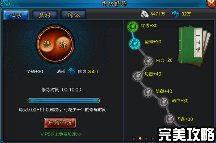 每次玩家点击开始修炼,需要消耗一定数量的修为,然后玩家会进入修炼时间,修炼时间一到玩家会立即获得该修炼属性加成 玩家可以点击马上完成,需要花费一定量的元宝,或者成为VIP5可以直接免费加速,无需消耗元 修为获得途径 (1)华山论剑每天的排名奖励