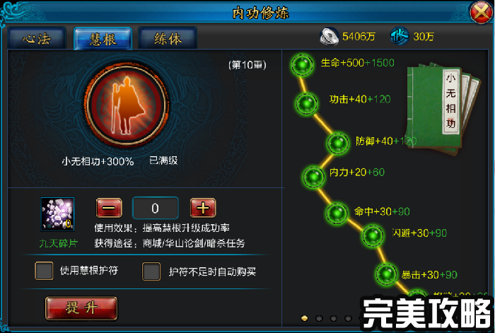 2、 内功强化 玩家学习到的任何内功都可以进行慧根提升,重数越高强化的效果就越强。 每次提升需要消耗一定数量的银子。 玩家可以选择用慧根符保护内功再升级的时候不会掉级, 玩家也可以选择使用道具“九天碎冰”提高内功升级的成功率。一次升级最多只可以使用5个哦。