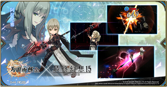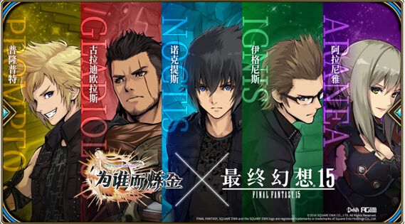 联动时间:2018年8月23日(周四)更新后 - 2018年9月22日(周六) ![]() 日系超人气三次元空间战略SRPG手机游戏《为谁而炼金》简体中文版与日本知名游戏公司-史克威尔艾尼克斯旗下的热门游戏《最终幻想15》将展开为期一个月的联动合作。《最终幻想15》自上市以来一直广受玩家好评,而在此次的联动中,特别为《最终幻想15》的联动英灵们增加了独特且有趣的剧情与招式来呈现其特色,活动期间让我们一起与四位帅气的伙伴以及女龙骑士,在巴贝尔大陆里尽情闯荡吧。 跨越时空,FF15英雄与炼金术师联手出击 此次联动中,《最终幻想15》的人气角色全员登场,包含主角【诺克提斯】、三位伙伴【伊格尼斯】、【普隆普特】、【古拉迪欧拉斯】、女龙骑士【阿拉尼雅】,炼金术师们可以通过联动副本、召唤等形式来获取联动英灵与专属武具。 ![]() 除了加入联动角色让炼金术师们操控外,也一并加入《最终幻想15》经典桥段,炼金的主角之一的【迪欧斯】也会与大家一同冒险! ![]()