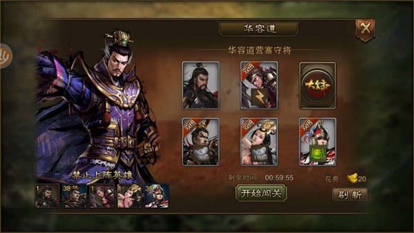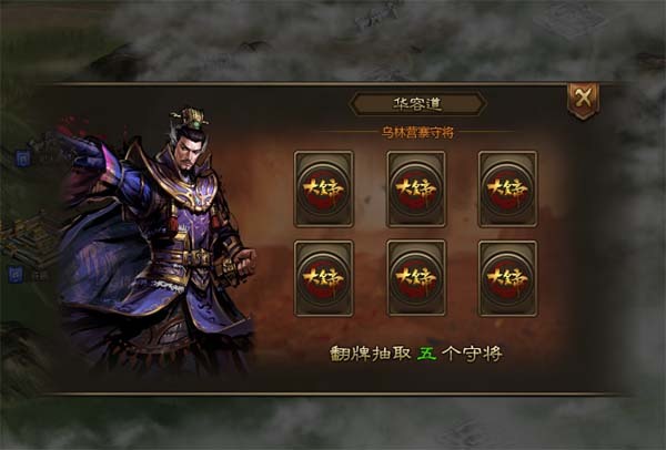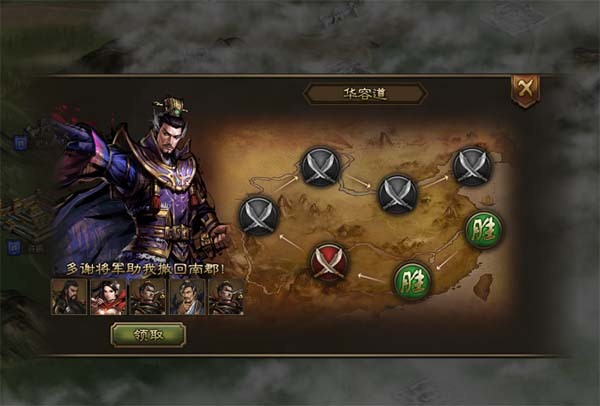 华容道共设置7个关卡,在每个关卡中以抽卡牌的形式抽取5名对手组成敌方部队。如果抽到自己所拥有的武将时,这些武将将不能上阵。每次翻出对手时会显示获胜奖励,其中包括各类资源及随机武将碎片。 7个关卡地名:乌林营寨-红血巷-杨林山-葫芦口-太平桥-毛家口-华容道