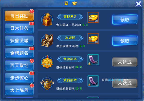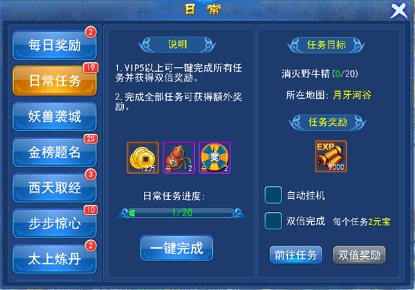 日常任务:忙碌挂机时的好推荐!如无双般收割着你的敌人!完成一系列的任务后会获得大量经验以及道具。