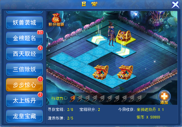 步步惊心:移动人物到下一个格子消耗一个行动力,移动到已经走过的格子不消耗行动力。每一个格子都有机会获得奖励,也有可能会遇到炸弹。奖励的内容是坐骑进阶丹与铜币