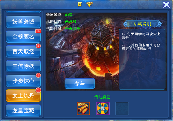 太上炼丹:消耗元宝进行炼丹,与队友组队炼丹会获得更多的奖励加成。每一次炼丹都有可能出现双倍爆点,点击全部爆点本次的炼丹会变成双倍奖励。