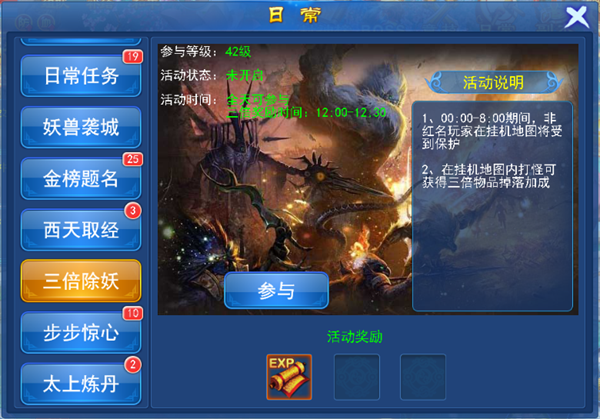 三倍除妖:在活动开启的时间内在挂机地图进行挂机打怪可以获得三倍物品掉落。