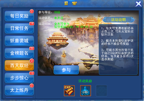 西天取经:护送经书。每天有一定的没费刷新经书品质的机会。在护送的途中可以被不同阵营与同阵营的玩家截杀。截杀同阵营的玩家不能获得奖励,截杀不同阵营且等级不低于自己五级的玩家护送的经书。运送成功的奖励为经验值与仙魂。