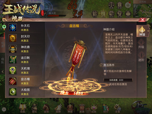 神器包括:开天斧、太极图、乾坤袋、凤凰琴、封天印等共18件,拿到神器不代表就大功告成,需要激活每件神器专属的属性加成,通过完成主线任务、累计杀怪、累计签到等激活神器的不同属性!除此之外,特定的玩法和夺取指定的荣耀,也可以进一步提升神器等级,从而提升加持的效果。