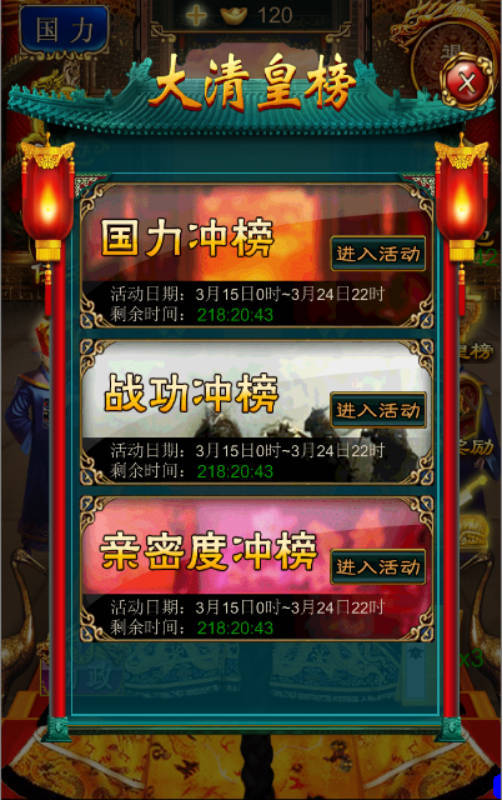 活动五、名臣贺新区,招募皇太极! 新区开启限时名臣招募,稀世名臣皇太极在新区等着你哦! 活动服务区:安卓24区/宁寿殿 活动时间:开服至-2016年8月9日23:59(5天) 本次招募活动开启大臣:皇太极!数量有限!过期不候! 参与方式-游戏→金銮殿→招募 活动六、累登惊喜多,豪礼无止境! 新区累计登陆活动震撼来袭!海量的福利,装满惊喜,每天送至圣上面前! 活动内容:新服价值千元礼包,四天惊喜,欢乐天天有,今日特别多 活动服务区:安卓24区/宁寿殿 活动时间:开服至-2016年8月8日23:59(4天) 附注1、以上奖励,游戏内签到---【累登】里领取; 活动七、上线做每日,冲榜富强国! 为了帮助新区的各位圣上冲击榜单,每日任务完成后将有丰厚的奖品!迅速壮大国力吧! 活动内容:在活动期间,完成每日的名臣任务,美女任务,日常任务,可以获得丰厚的奖励 活动服务区:安卓24区/宁寿殿 活动时间:开服至-2016年8月8日23:59(4天) 附注1、金銮殿→任务→领取名臣任务,美女任务,每日任务