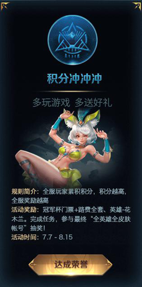 7月23日,王者荣耀冠军杯暨暑期盛典就将举办,七大线上助阵活动会在近段时间内先后开启,今日七大活动之“积分冲冲冲”正式启动。为了积分为了奖励,更为了全皮肤全英雄账号,《王者荣耀》值得所有召唤师“无处不团,你也在玩”! 关于腾讯游戏 腾讯游戏,全球领先的游戏开发和运营机构,国内最大的网络游戏社区,以“用心创造快乐”的理念,腾讯游戏通过在多个产品细分领域的耕耘以及对四大平台的打造,致力为玩家提供“值得信赖的”、“快乐的”和“专业的”互动娱乐体验。腾讯游戏,用心创造快乐! 关于《王者荣耀》 《王者荣耀》是腾讯第一5V5英雄公平对战手游,腾讯最新MOBA手游大作!5V5王者峡谷、5V5深渊大乱斗、以及3V3、1V1等多样模式一键体验,热血竞技尽享快感!海量英雄随心选择,精妙配合默契作战!10秒实时跨区匹配,与好友组队登顶最强王者!操作简单易上手,一血、五杀、超神,极致还原经典体验!实力操作公平对战,回归MOBA初心! 赶快加入《王者荣耀》,随时开启你的激情团战!