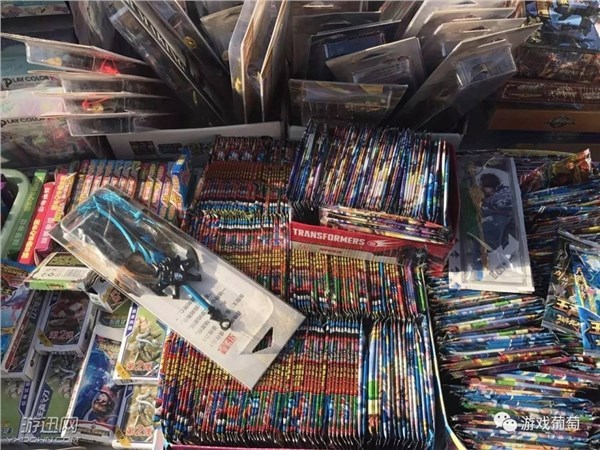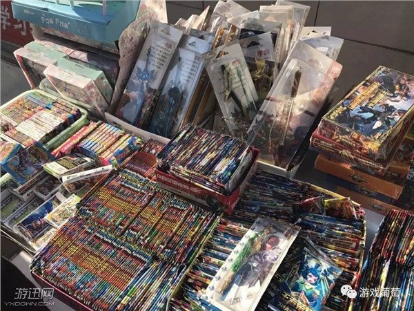 说起卡牌,很多人第一个想到的就是游戏王。其实很多热门游戏、动漫都有实体卡牌,其中不乏盗版,比如最近非常受小学生欢迎的《王者荣耀》山寨实体卡牌。 下午3:10,北京西城区的一所小学打开校门,成百上千名头顶小黄帽,佩戴红领巾的小学生从校门口涌了出来。孩子们的队伍浩浩荡荡,但十分有序。抵达校门外指定的家长接送地点之后,他们忽然一哄而散,叽叽喳喳地转过头来,朝刚才路过的一家店面走去。 这家店规模不大,主要出售文具和玩具,店外敞开的摊铺上摆放着很多与游戏相关的周边商品,而其中最受欢迎的,便是1块钱一包,一包里有8张配备不同皮肤英雄卡的《王者荣耀》卡牌包。