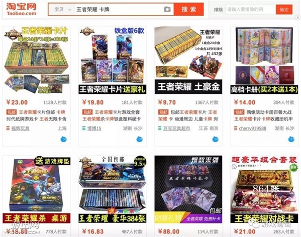 拿着iPad的是茉莉 说真的,和孩子们聊天的感觉很奇妙,你很容易跟不上节奏,感觉自己确实老了。这场对话的大致内容如下,看完后你大概可以明白,《王者荣耀》卡牌在他们圈子里意味着什么。 “你是什么时候开始玩这个卡牌的?” “我朋友玩这个游戏,挺好玩的,我在旁边看。后来看到有卖这个的卡片,觉得画质蛮不错的,就开始收集啦,关键看画质。” “别的游戏的卡太Rua了,好多卡都是奇形怪状的,不好看。” “之前有同学在玩吗?” “小莫在玩!” “小浩在玩!” “他朋友在玩!” “你们都喜欢收集哪个角色?” “我喜欢不知火舞。” “我喜欢兰陵王。我看他攻击特别高。” “我喜欢貂蝉,但这个逐梦之音太蓝了……” “我喜欢李白!” “我喜欢老夫子!” “老夫子我多的是。” “哥哥,我有三张老夫子!” “你们都什么时候买卡呀?” “放学之后买,就是太便宜了,带1,2块钱就能可以买几包。” “心情好了就买好多,心情坏就不买。” “怎么看哪张卡最厉害?” “史诗最厉害,因为它是史诗!” “我觉得贵族限定厉害。” “我也觉得贵族限定厉害。” “贵族限定是要充钱的,你充到一定的钱就可以购买这个皮肤。” 你们平常会跟别人换卡吗? “肯定会跟别人换!” “她把好多卡都换给了小莫,然后小莫给了她这些女的。” “本颜控表示,丑!我用三张男的换了雅典娜。我就喜欢女性角色,颜控嘛,好看。” “你们都什么时候看这些卡或者玩它们?会打牌么?” “就是在学校桌子的位格里倒腾。” “不打,就是看。” “老师不没收吗?” “会吧,但是没发现过。” “你们班有多少人在玩这个卡呀?” “好多,十来号人。” “玩游戏的呢?” “就4,5个吧。” “不是,肯定更多。” “你爸妈平常让你玩《王者荣耀》么?” “我不怎么玩这个了,我妈说手机屏幕太小了,不让我玩这个。” “我一周只能玩一次。” 从这段对话中,我们很容易提取几个信息: 1.在他们的班级中,《王者荣耀》卡牌比《王者荣耀》手游流行,且购买、交换和讨论都是相当日常的行为; 2.卡牌比手游流行的原因在于,卡牌只需要1块钱就可以购买,而且可以在学校内偷偷把玩;而上学带手机是一件家长、老师都反对的事情; 3.低廉的价格、游戏的流行和卡牌原画的水准是《王者荣耀》卡牌流行的几大原因; 不难想象,无论是价格、使用场景还是社交价值,《王者荣耀》卡牌都是相当适合孩子们收藏的玩具,这也是它在校园当中如此流行的原因。 《王者荣耀》的盗版周边产业链 而在这些被小学生热捧的卡牌背后,还隐藏着一套更为庞大的盗版周边产业链。 在淘宝上搜索“王者荣耀卡牌”关键字,葡萄君已经发现了3000多款类似产品,它们的销量从几百到上千不等,市场规模颇具雏形。