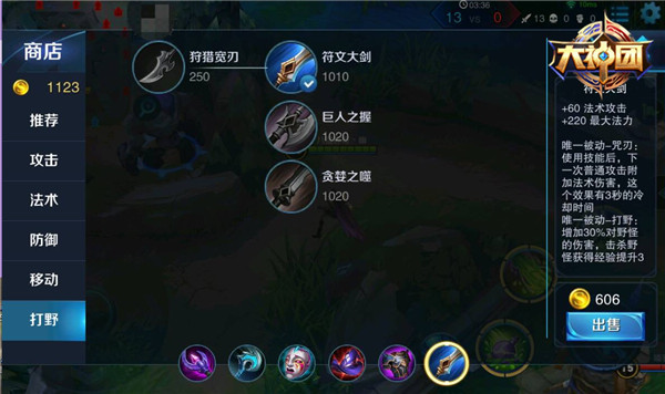 【打野出装】 扁鹊打野出门装为狩猎宽刃,增加对野怪的伤害能力。然后通过打野来获取金币,将打野装备升级为符文大剑。符文大剑可增加对野怪的伤害增加30%和击杀野怪获得的经验提高30%外,还可增加法攻和法术值,并且让扁鹊在释放过技能后,普攻额外附带法术伤害。扁鹊的输出主要依靠攻击附带的中毒效果,而普攻额外附带的法术伤害,可以让扁鹊的输出更上一层楼,方便扁鹊更快的清理野怪,扁鹊的致命灵药和善恶诊断技能也是两个非常不错的群攻技能。